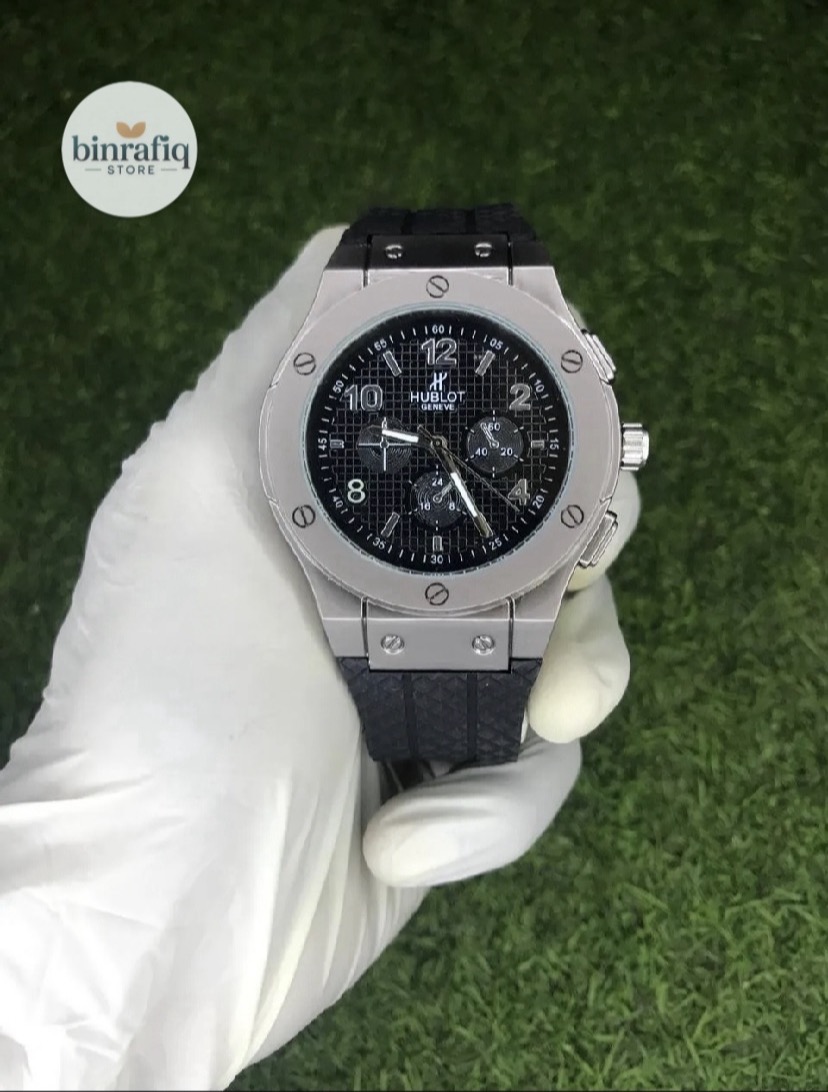 Quartz chronograph watch with bold Big Bang design, stainless steel case, black dial, rubber strap, and sporty luxury look.